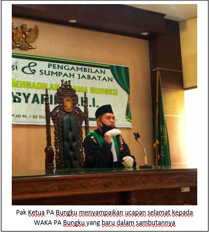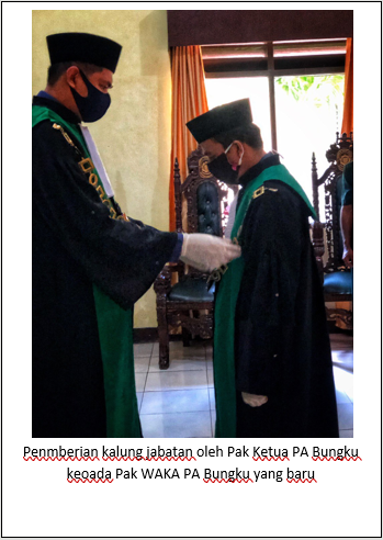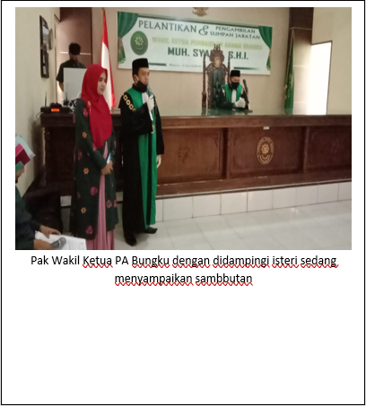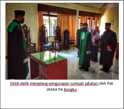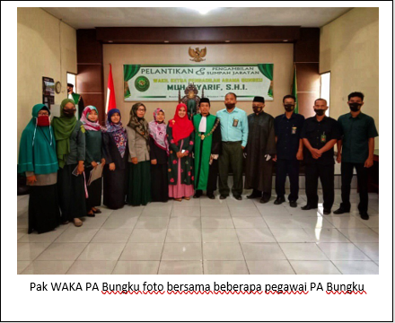 Acara yang dilaksanakan mulai pukul 08.00 WITA tersebut, dihadiri oleh Ketua Pengadilan Agama Bungku, Para Hakim, Panitera dan Sekretaris, Pejabat Struktural dan Fungsional serta seluruh pegawai kontrak Pengadilan Agama Bungku, beserta sejumlah Ibu Darmayukti Pengadilan Agama Bungku. Dalam Upacara pengambilan sumpah jabatan dan pelantikan yang langsung diambil sumpahnya oleh Ketua Pengadilan Agama Bungku dengan bertindak sebagai saksi Panitera Pengadilan Agama Bungku Ibu Hj. Sukirah, S.Ag., dan Sekretaris Pengadilan Agama Bungku Bapak Sabrin, S.Ag., serta Bapak M. Arif sebagai Rohaniawan.